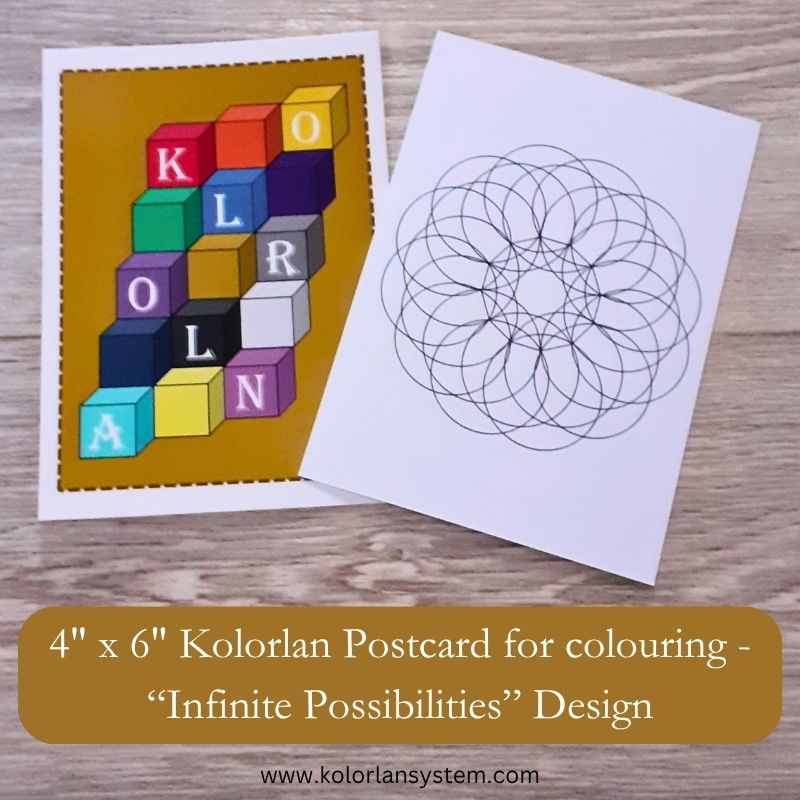 Unwind and unleash your creativity with our 4" x 6" (A6) Postcard - Infinite Possibilities Design. Use the Kolorlan System to reconnect with your true Self and explore your inner world through colour and Sacred Geometry. Perfect for adult colouring, relaxation, and mindfulness. Frame your beautiful art and add a touch of inspiration to your space.