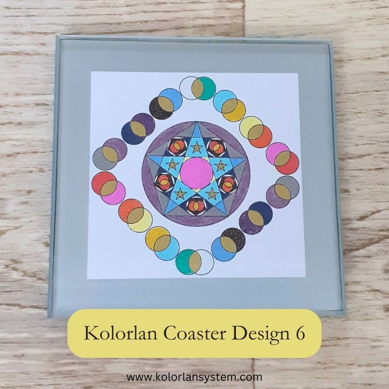 This is a one-off Kolorlan Coaster created with Sacred Geometry and colour for a unique energetic frequency. Water responds to this frequency to form beautiful crystals - structured water - that may contribute to feelings of peace and wellbeing. (See more in the video). This Kolorlan Coaster has been hand-coloured and assembled by me and is a unique design that will not be repeated in exactly the same way.